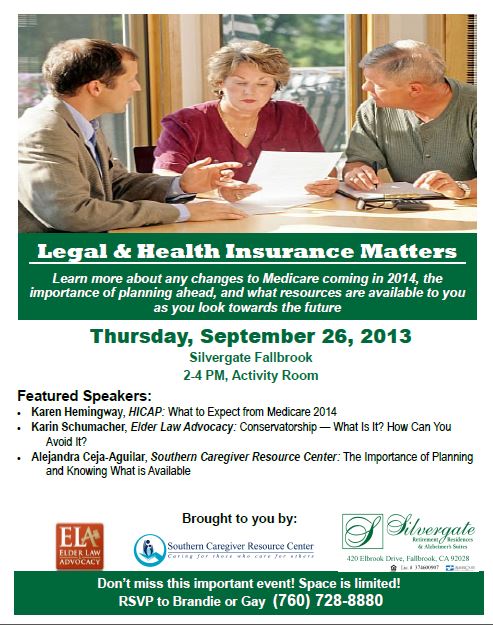 Learn more about any changes to Medicare coming in 2014, the importance of planning ahead, and what resources are available to you as you look towards the future,Thursday, September 26, 2013, 2-4 PMSilvergate Fallbrook, Activity RoomSpace is limited! RSVP to Brandie or Gay today! (760) 728-8880